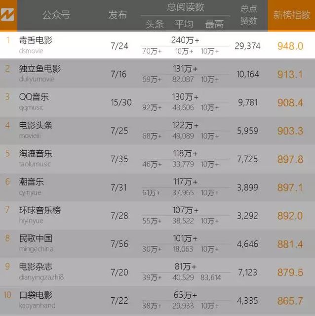新榜最新發布的影視音樂類微信影響力排行榜